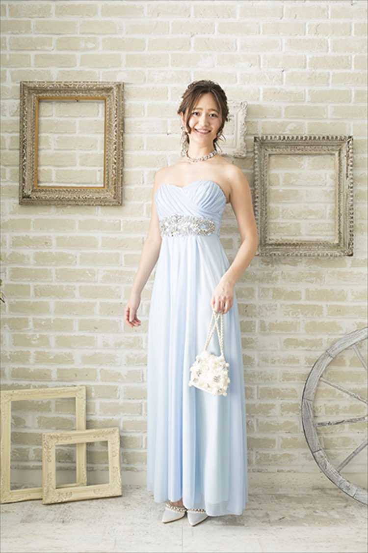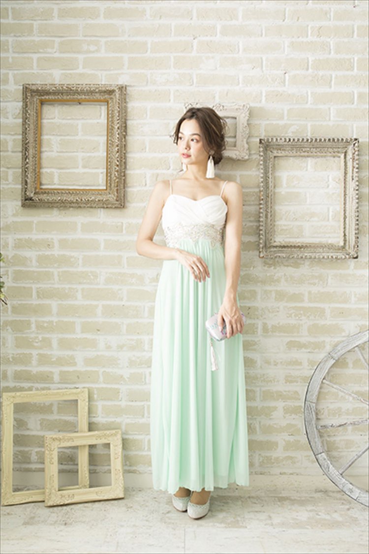 ミントグリーン×ホワイト胸下ビジュー付きロングドレス