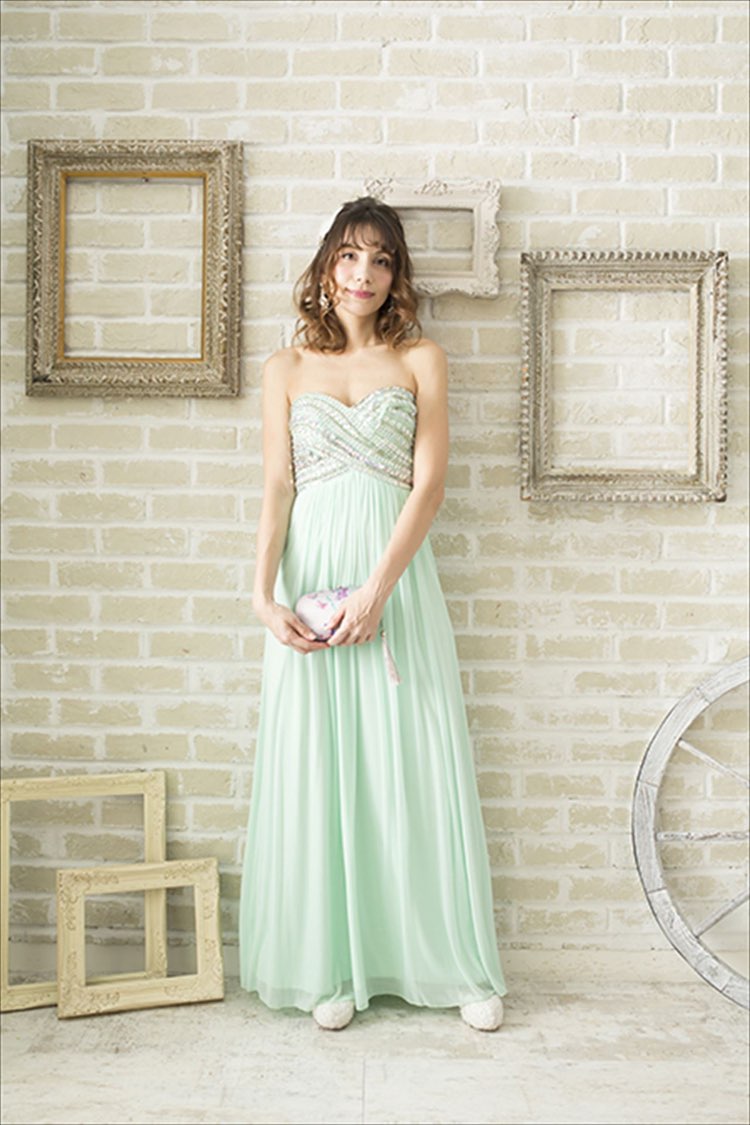 ミントグリーン胸元ビジュー付きAラインロングドレス