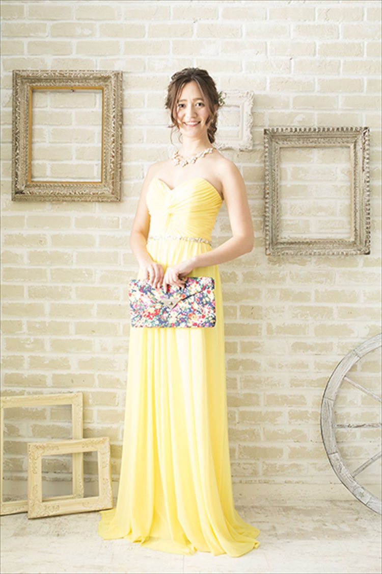 ビビッドイエローウェストビジュー付きシンプルスレンダーAラインドレス