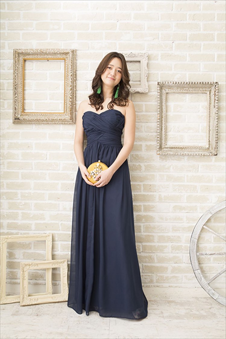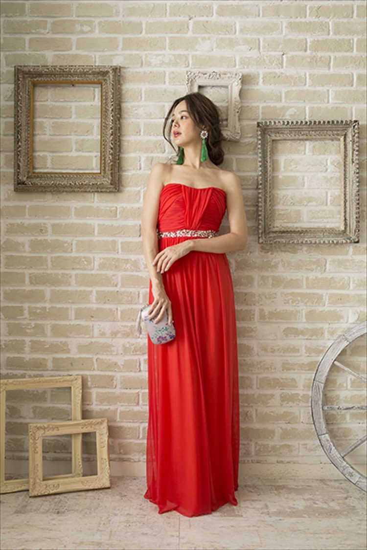 鮮やかレッド胸下ビジュー付きスレンダーロングドレス
