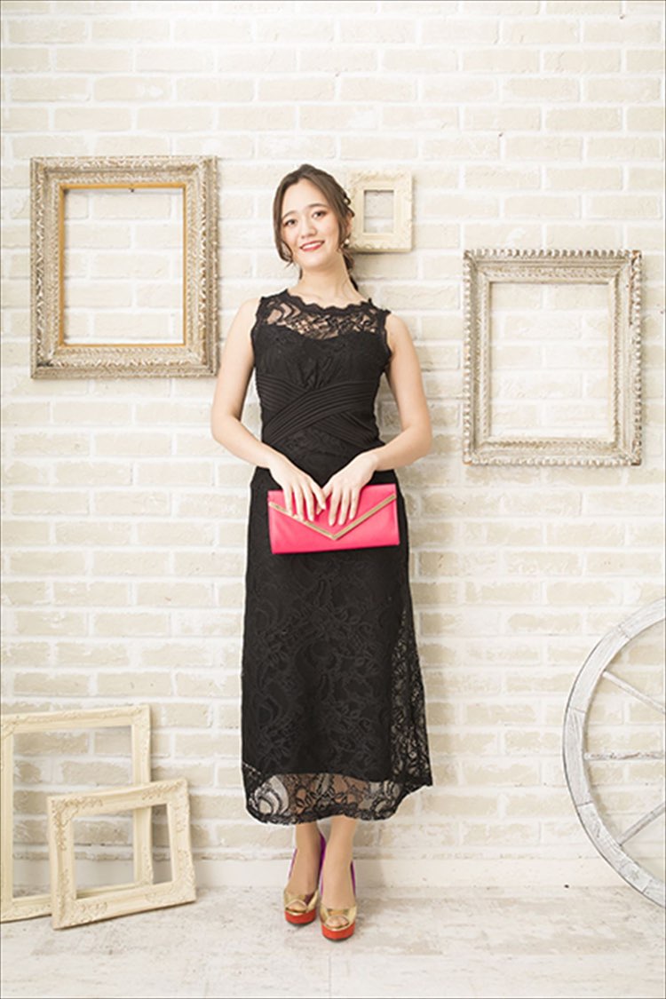 鮮やかレッド胸下ビジュー付きスレンダーロングドレ...