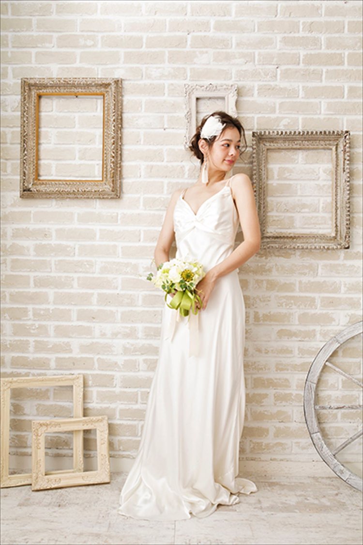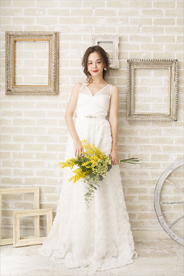 胸元シースルーVネックウェストビジュー付きお花デザイン 花嫁二次会 1.5次会 向けボリュームドレス