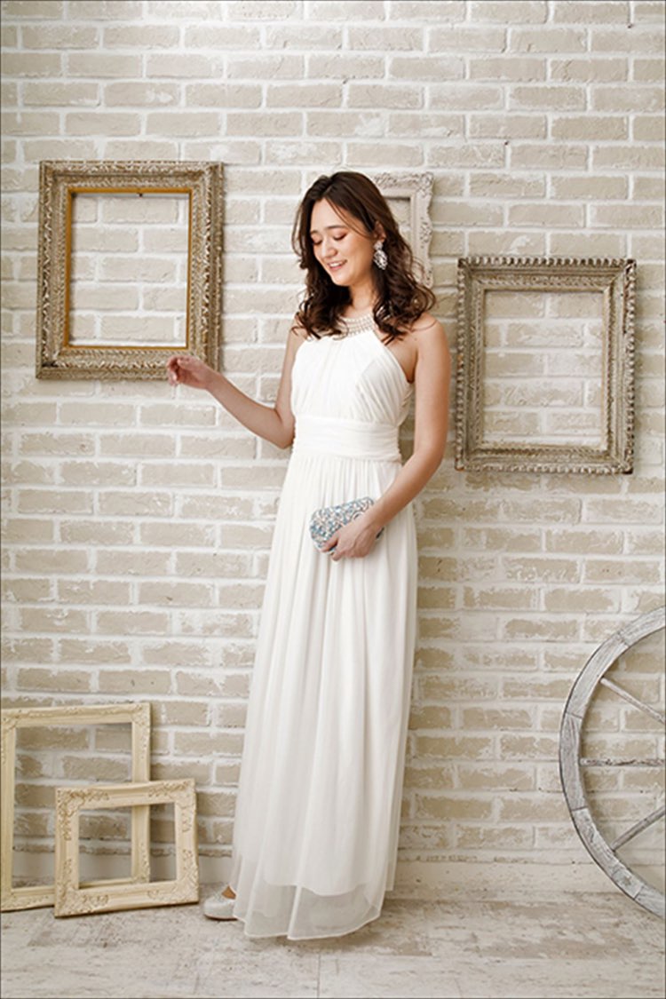 ベージュグレー首元ビジュー付きロングスレンダードレス
