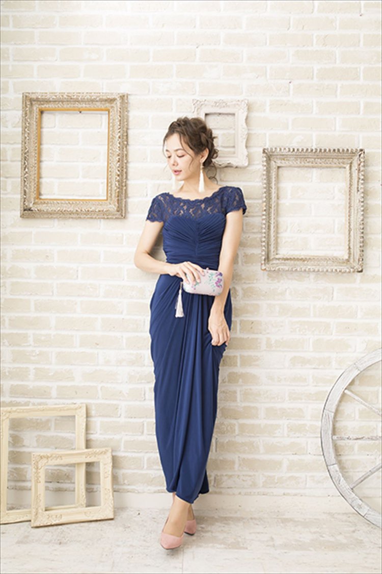 BCBGネイビー光沢アシンメトリー首元ビジューIラインドレス