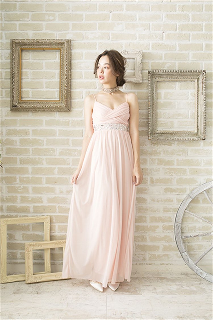 ウエスト肩ビジュースモーキーピンクサテンロングドレス