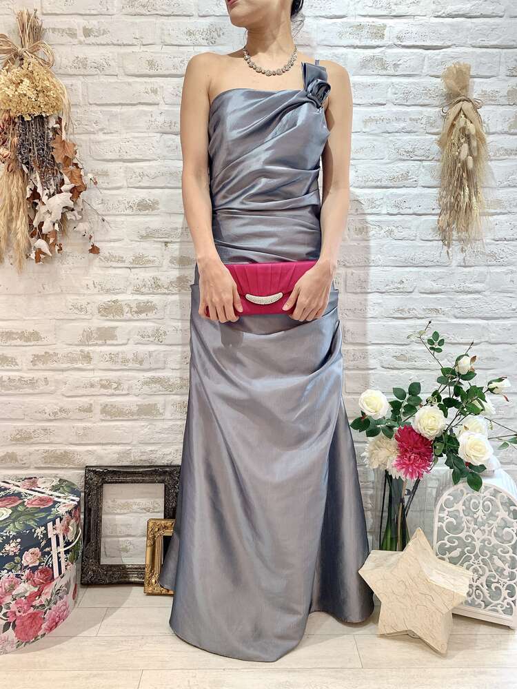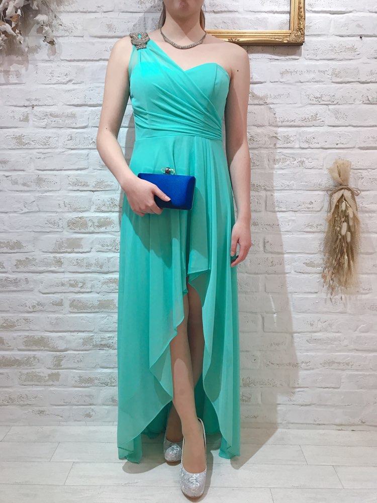 グリーンビジューワンショルダーイレギュラースカートロングドレス