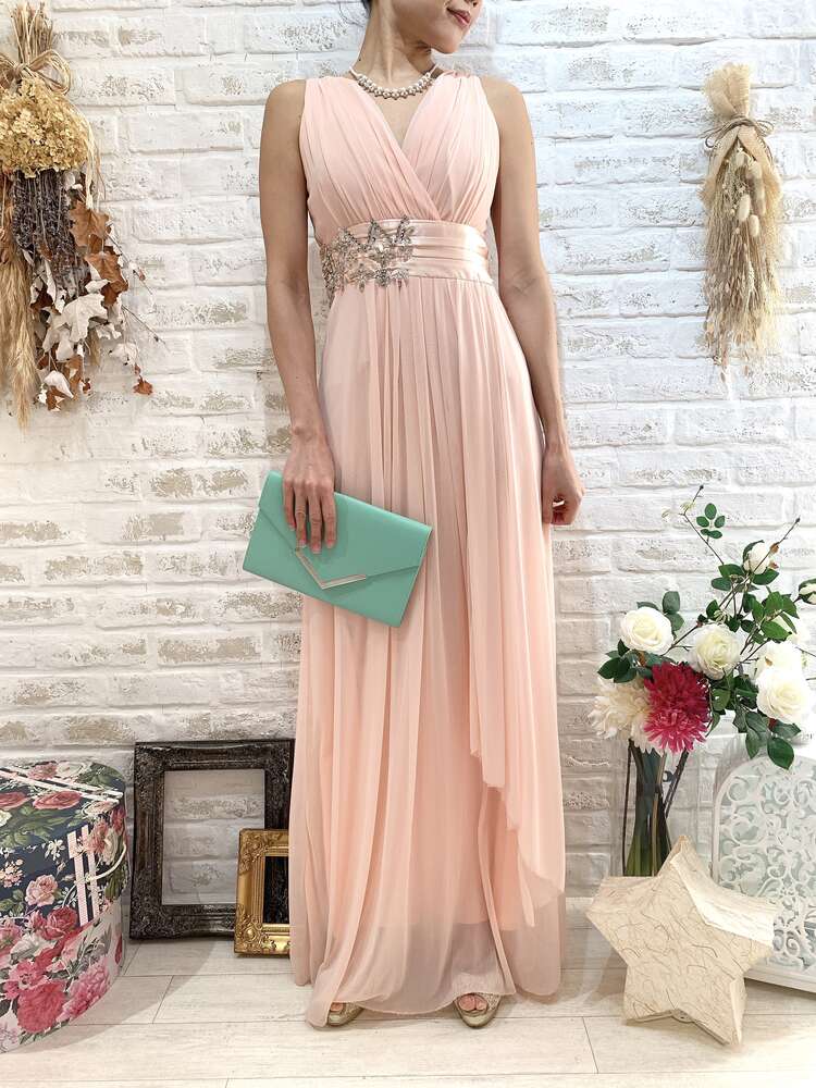 ピンクウエストビジューカシュクール型肩有ロングドレス
