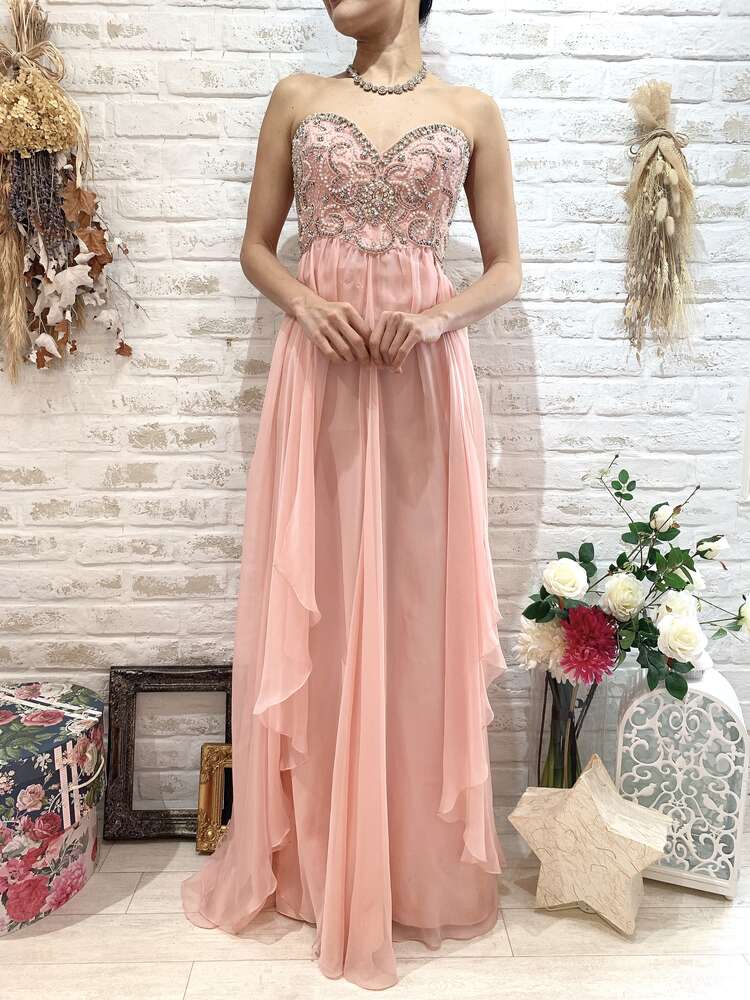 ピンクウエストビジューカシュクール型肩有ロングド...