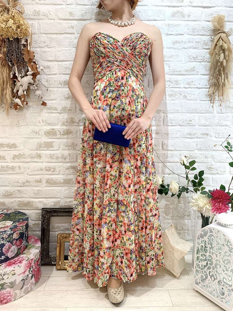 ウエスト花コサージュ付ネイビーロングベアドレス