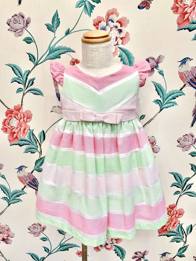 80〜90cmピンク×グリーンストライプフリルスリーブドレス