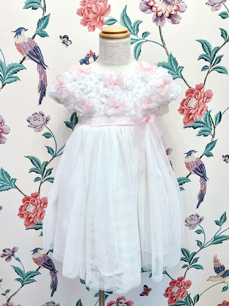 80〜90cmホワイト×ピンク フラワーフリルチュールドレス