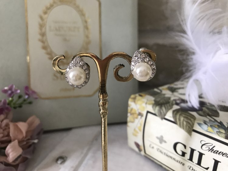 シルバー大粒パール付リーフ型ビジューイヤリング