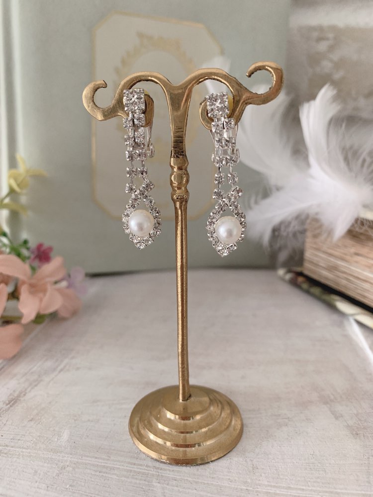シルバー一粒パール付き長方形ダイヤイヤリング