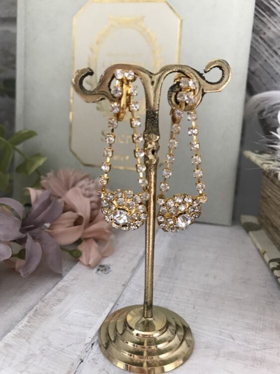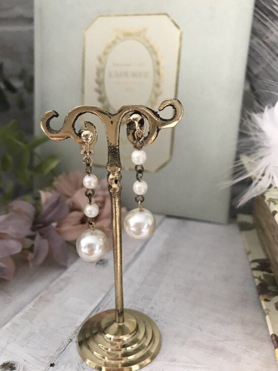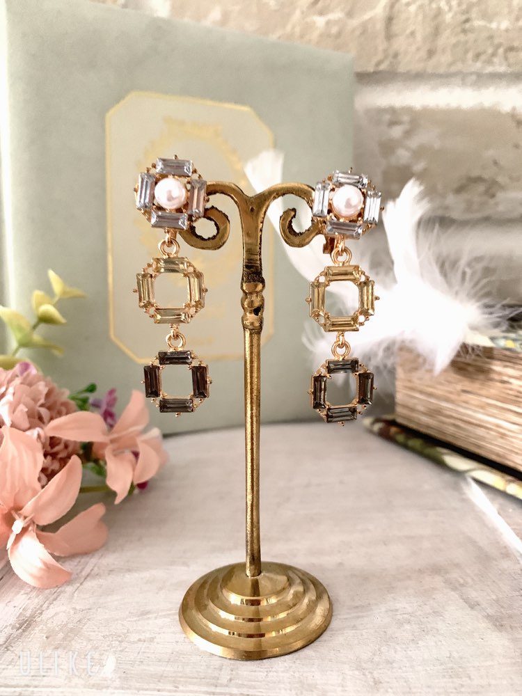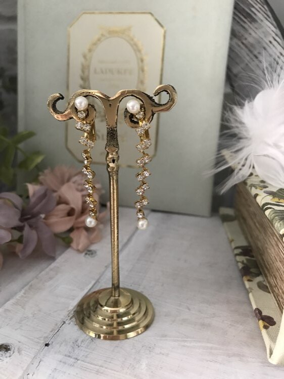 ゴールドロングドロップ型ビジューパール付イヤリング