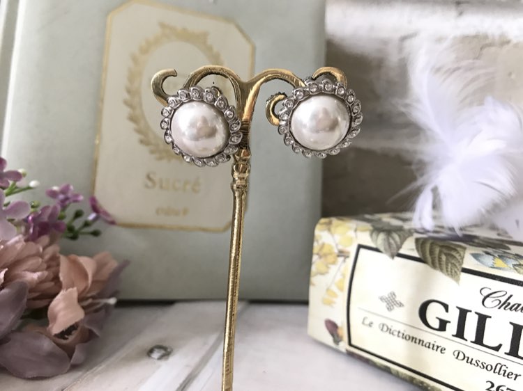シルバー大粒パール付花形ビジューイヤリング