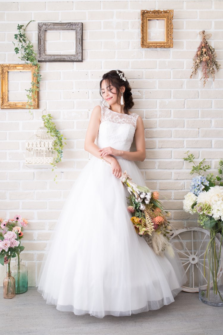 純白レースAラインチュールボリュームドレス