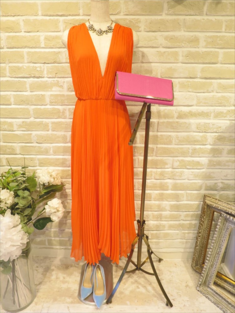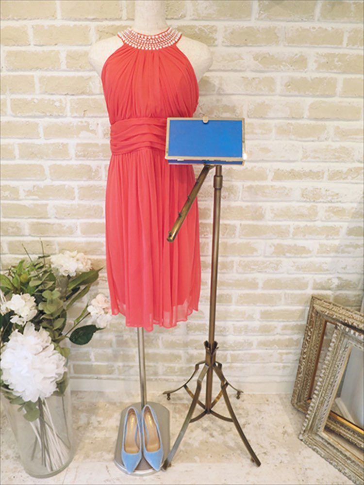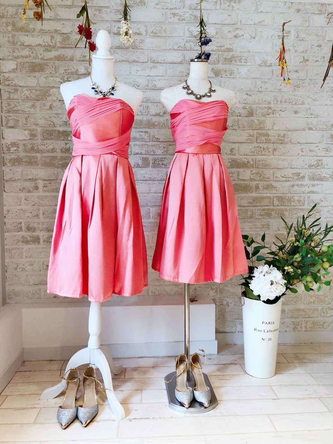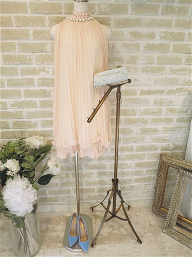 ベビーピンクのVカットウエスト切り替えノースリーブドレス