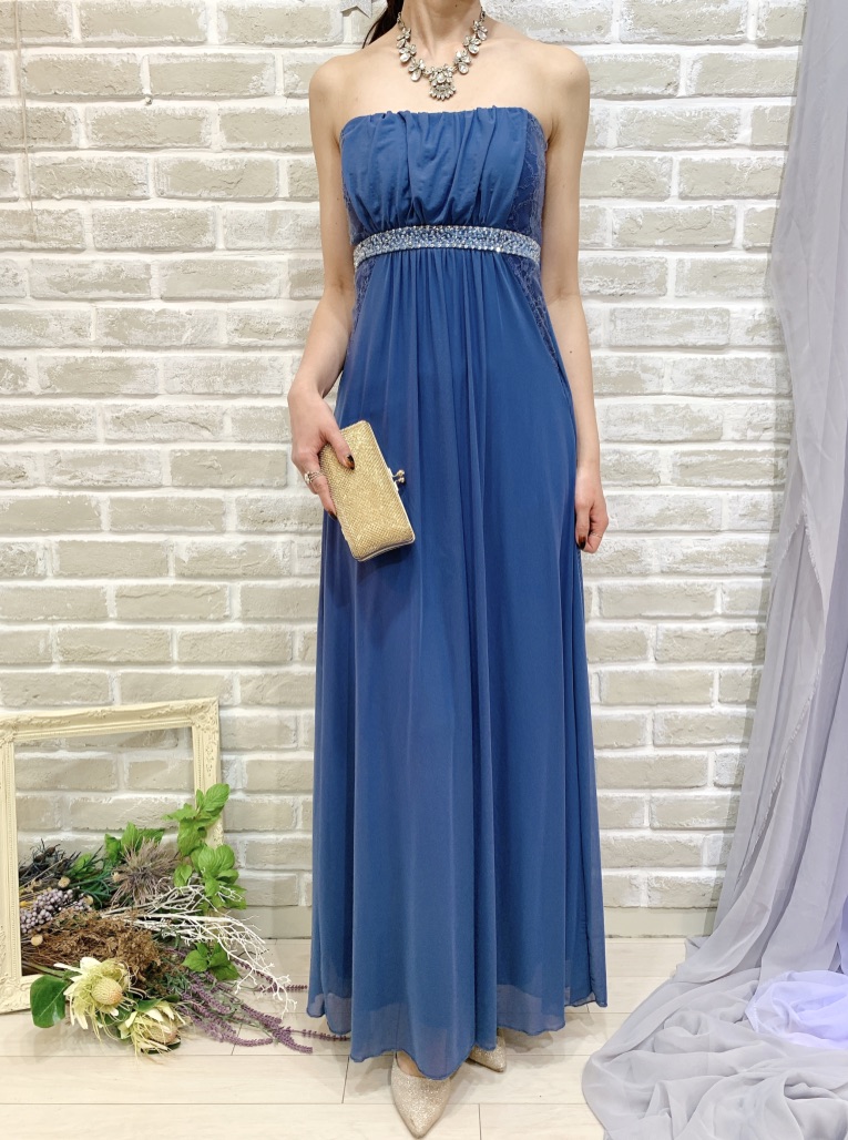 くすみブルー袖あり胸元スパンコールリーフ模様ロングドレス