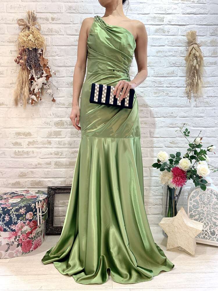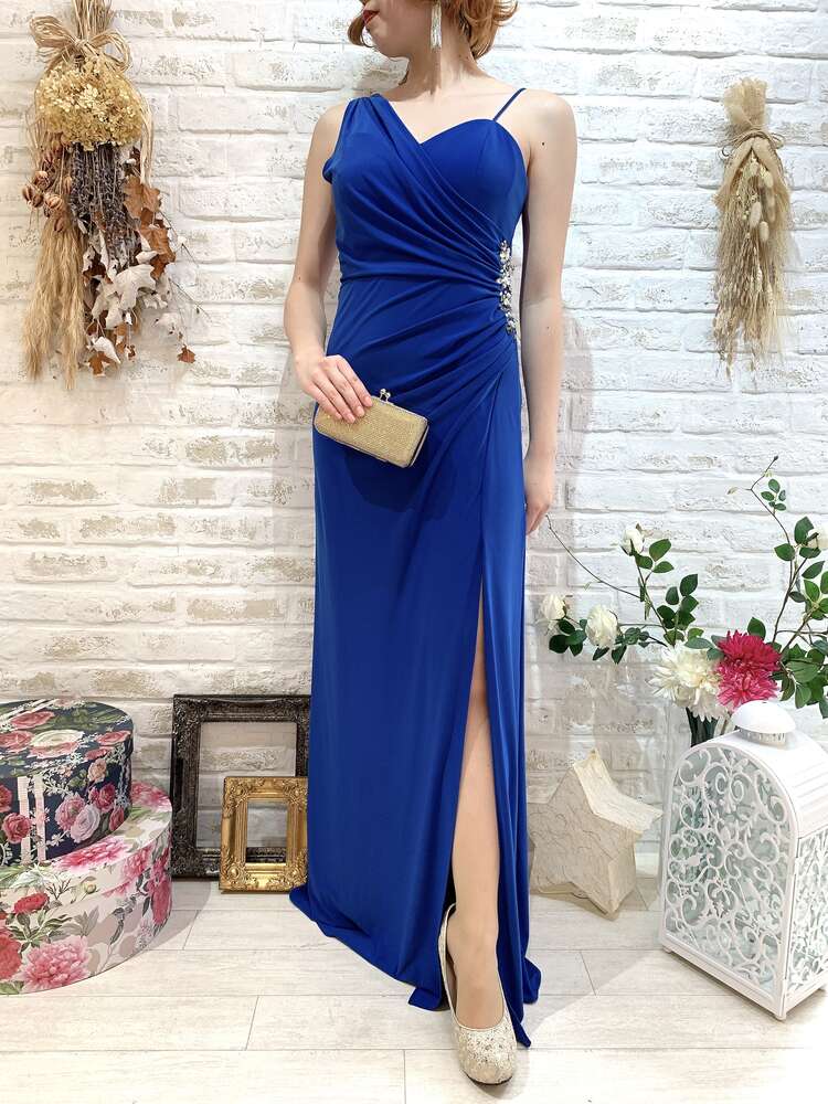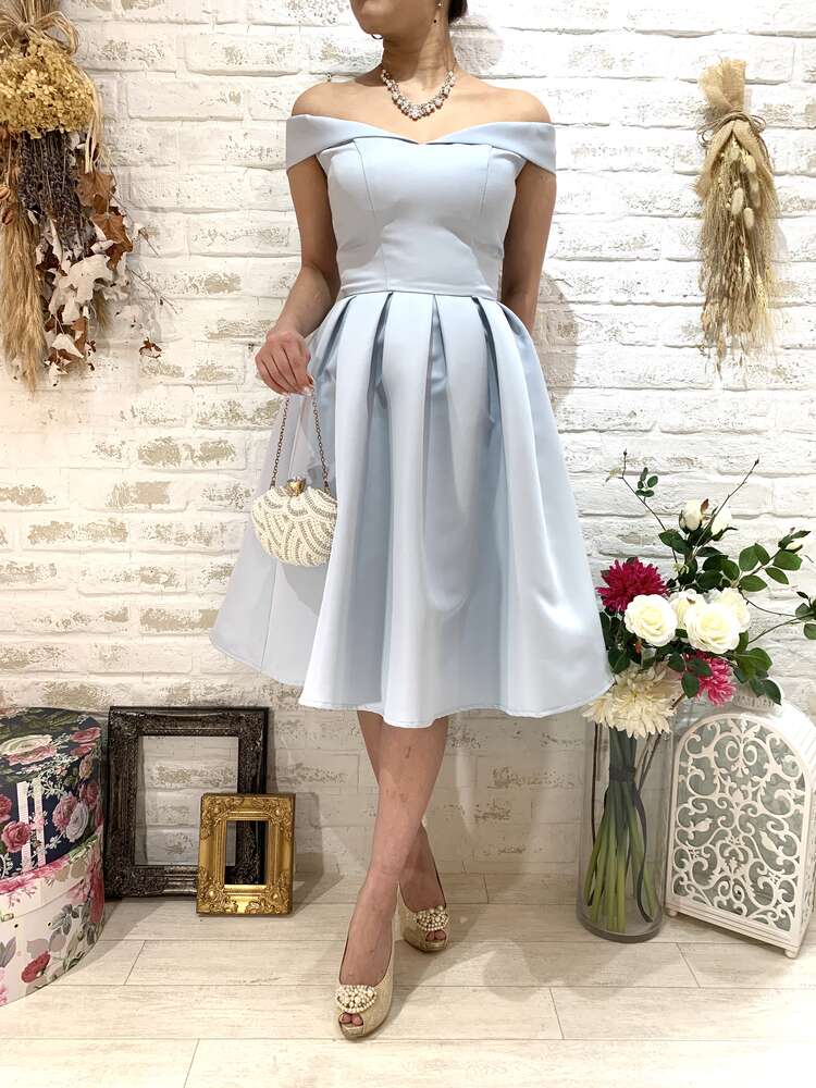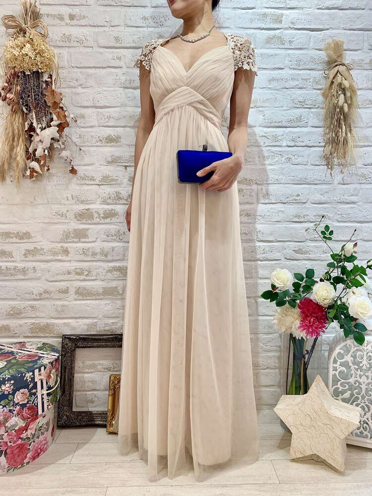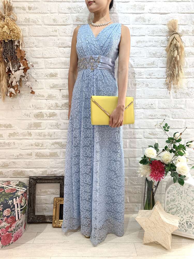 水色ウエストビジュー花柄全レース肩有ロングドレス