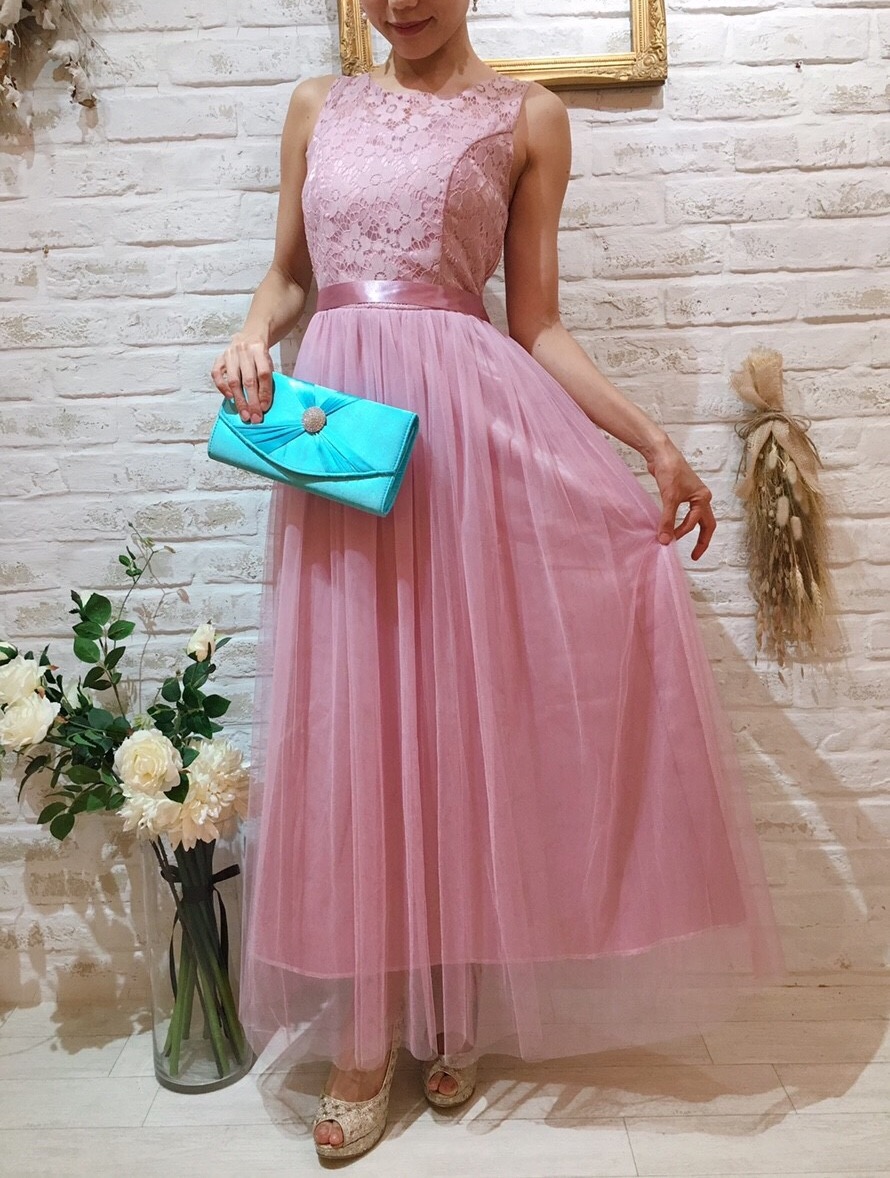 ウエストリボン大人ピンクレース×チュールスカートロングドレス