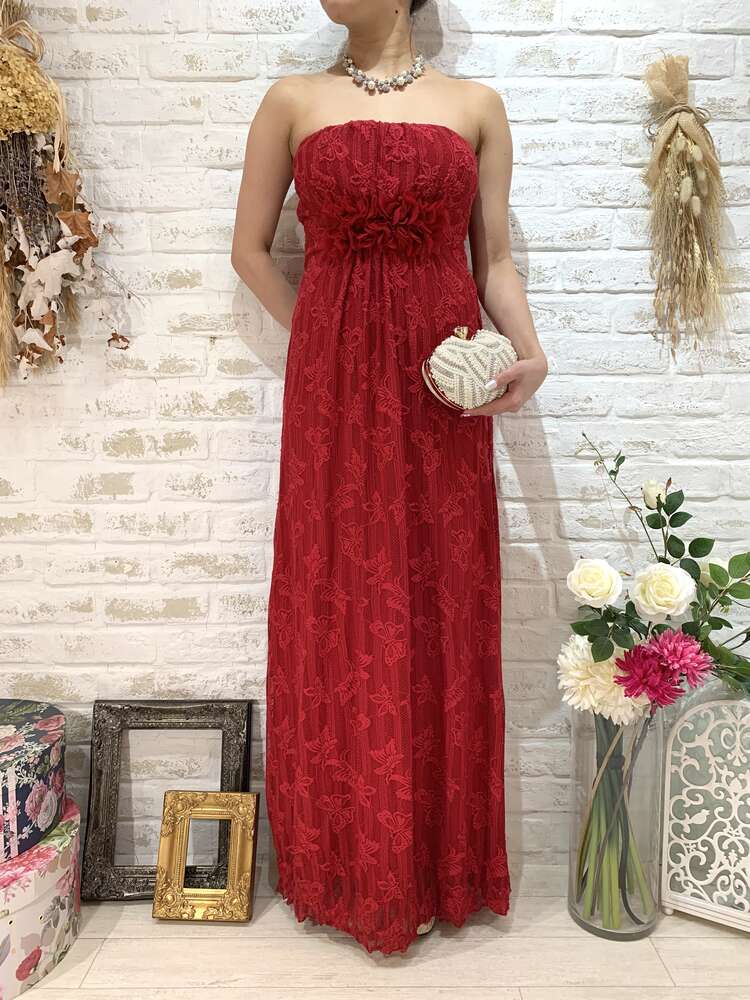 ウエストコサージュ全レースロングベアドレス(レッド)