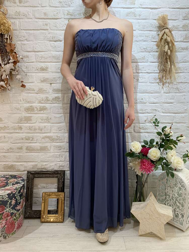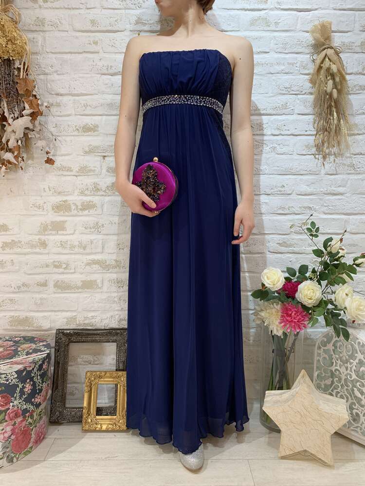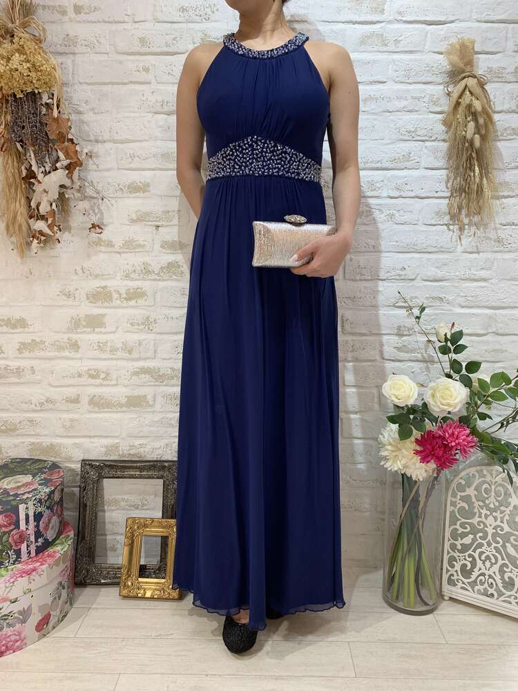 首・ウエストビジューアメリカンスリーブロングドレス(ネイビー)