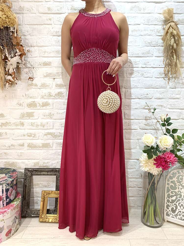 首・ウエストビジューアメリカンスリーブロングドレス(ワイン)