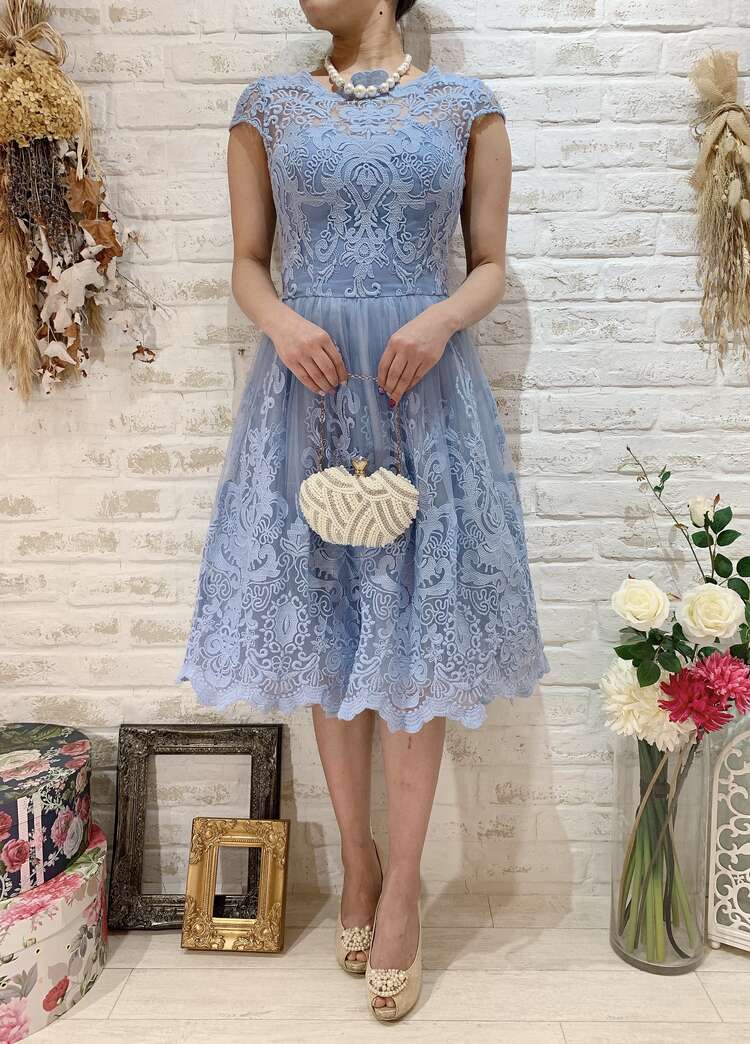 フレンチスリーブレースボリュームスカートドレス(ブルー)
