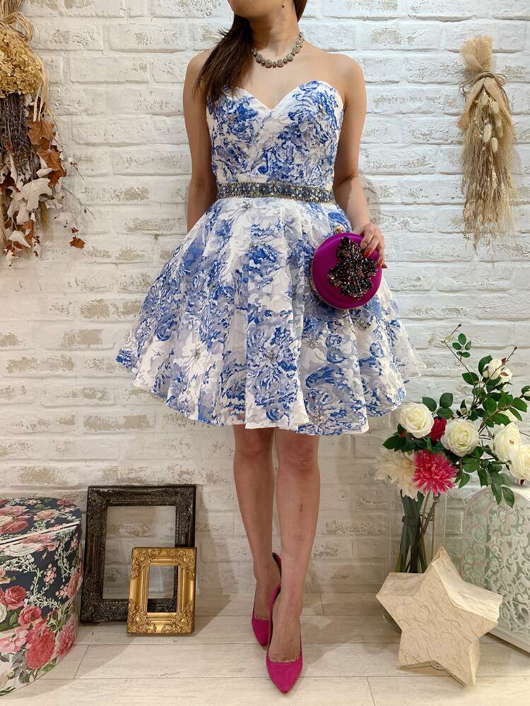ブルー×ホワイト花柄ビジューベルトミニベアドレス