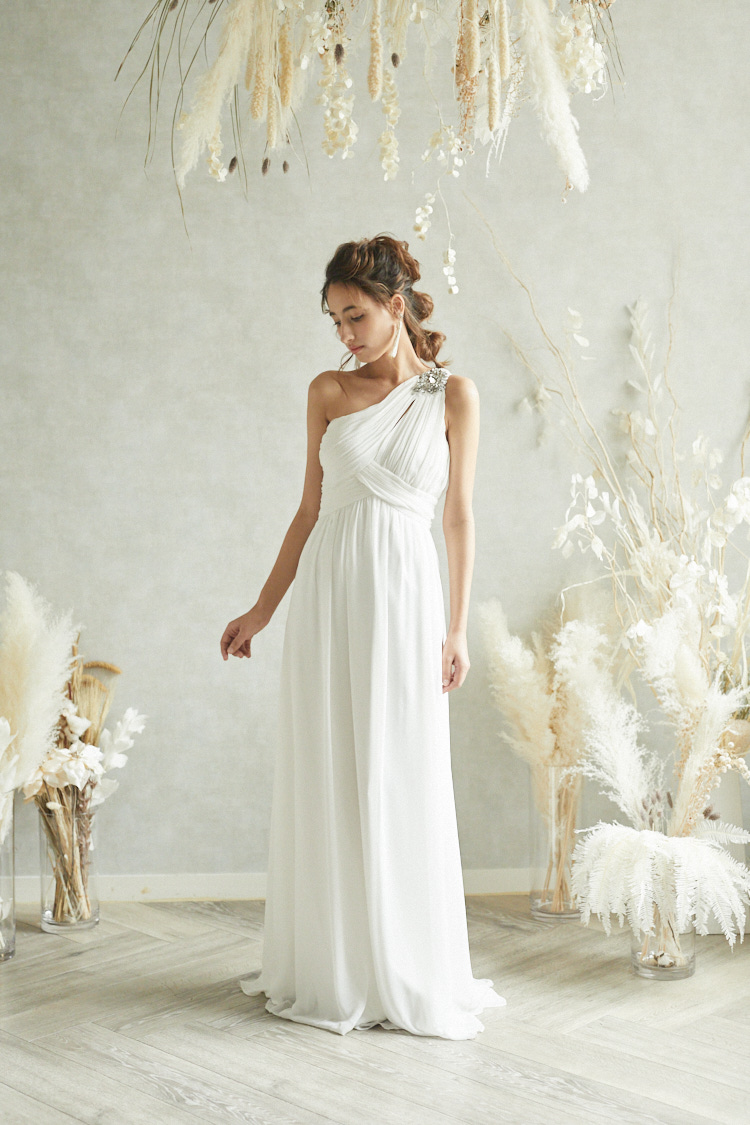 ウエストビジューラインイレヘムホワイトロングベアドレス