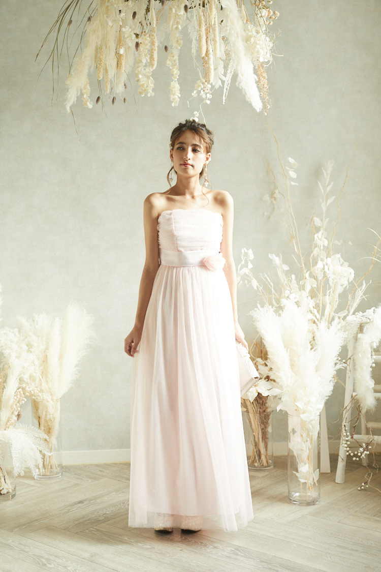 ホワイト肩透けチュールウエストリボン付きロングドレス