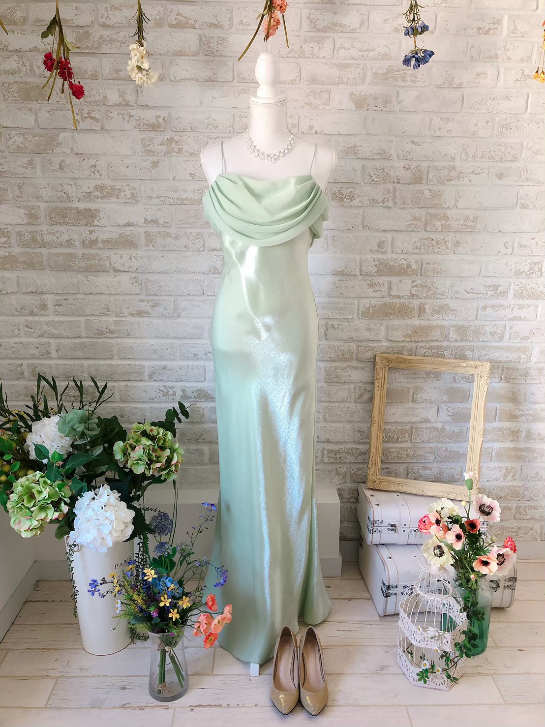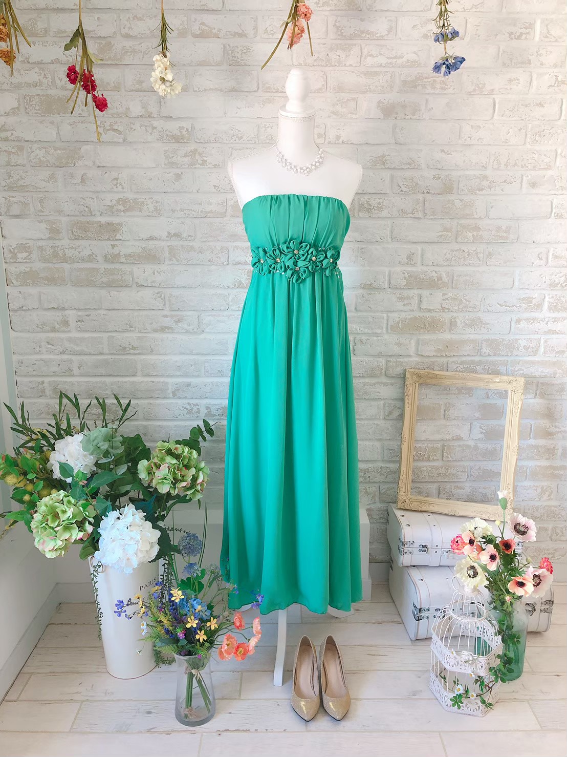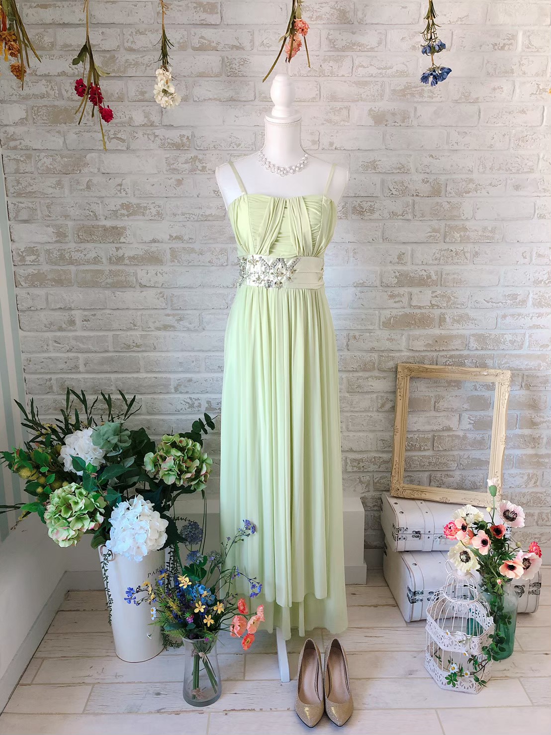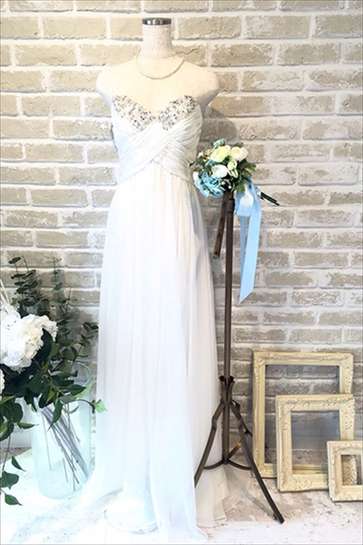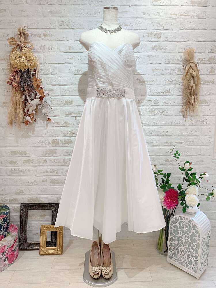 ウエストビジューハリ素材リボン付きホワイトアンクル丈ドレス