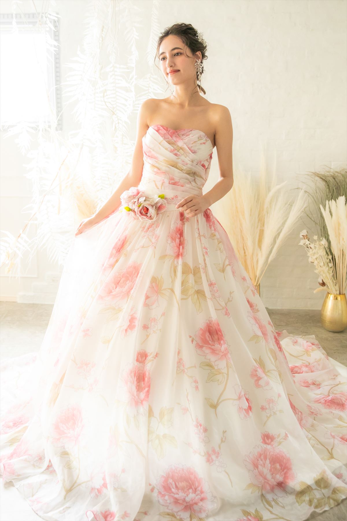 ホワイト袖ありスカートキラキラボリュームロングウェディングドレス