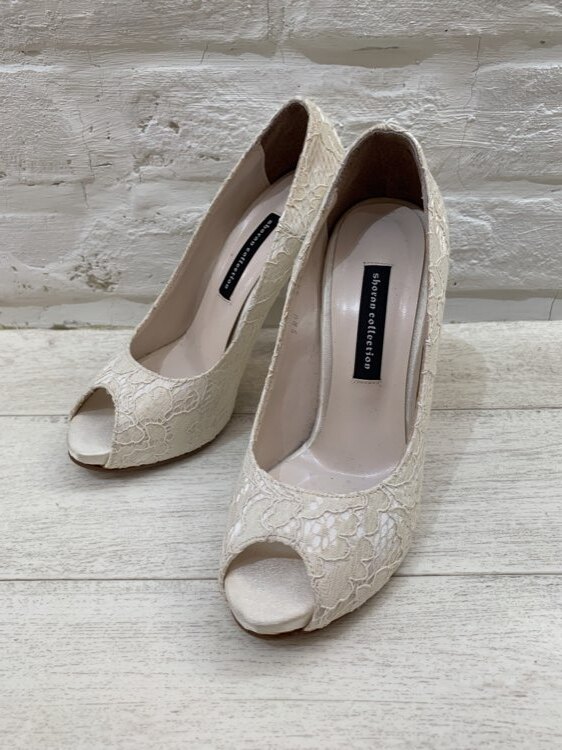 パールコサージュ付ゴールドラメオープントゥパンプ...