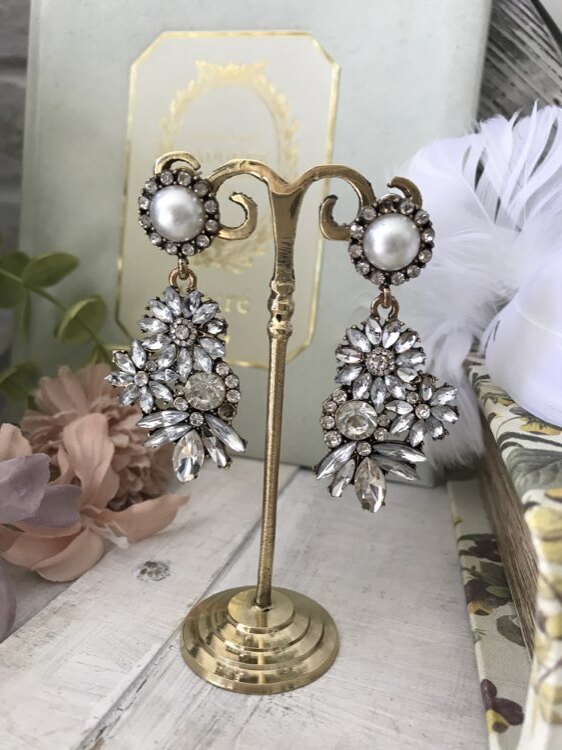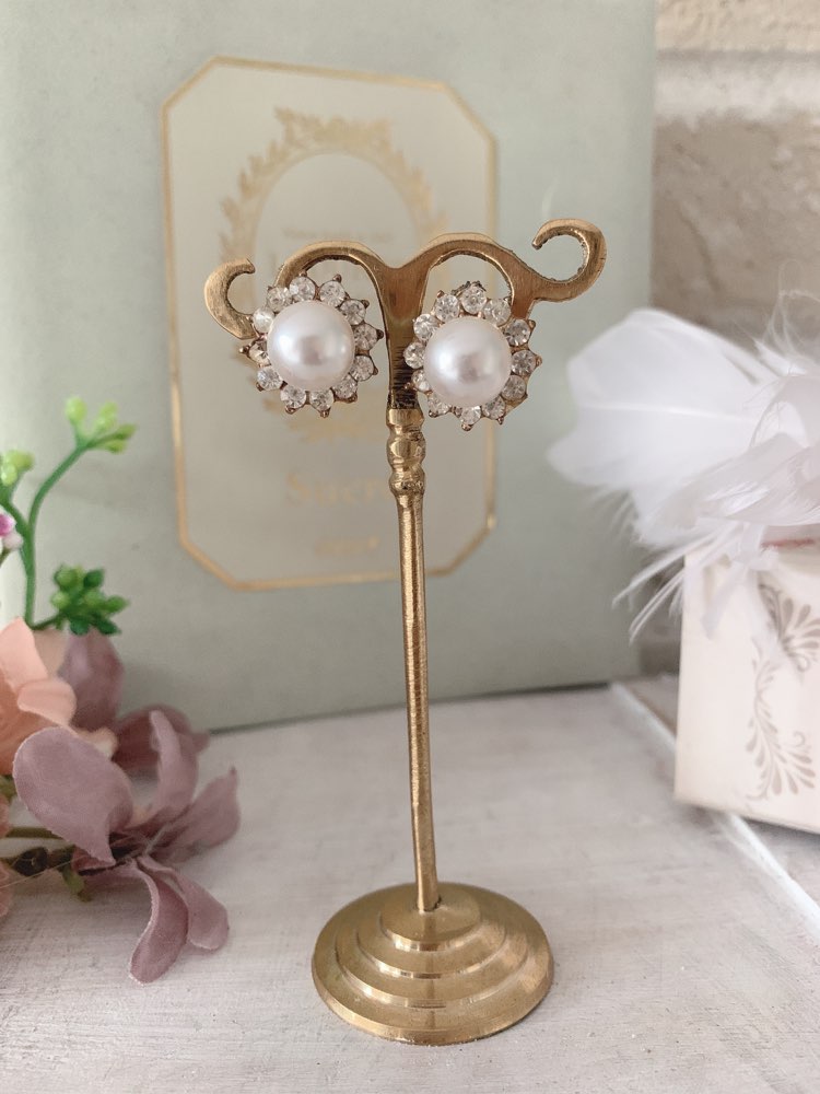 ゴールド花形ビジュー楕円パール付ドロップピアス
