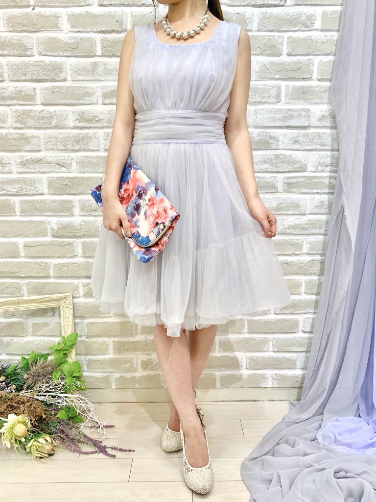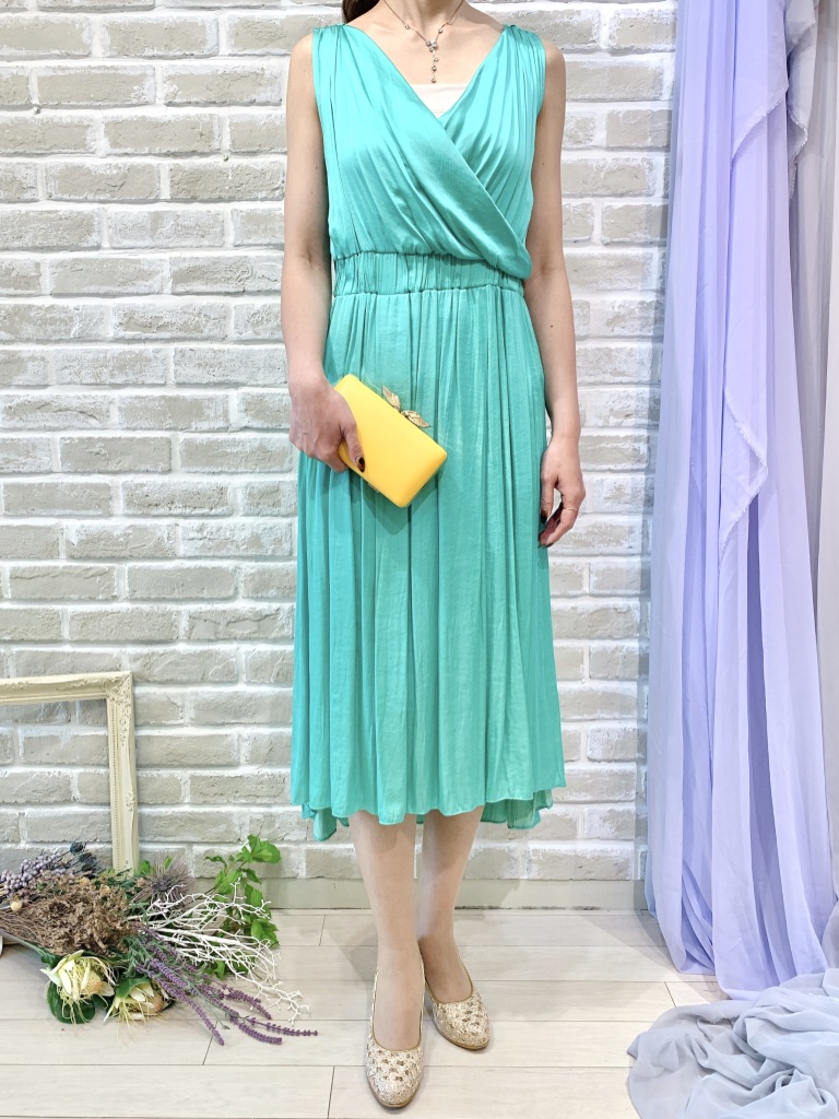 ★エメラルドグリーンチュールスリーブビジューフレアSKドレス