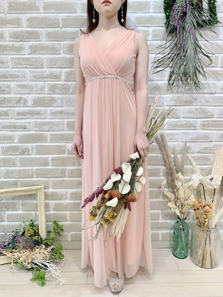 アプリコットビジュー付きアメリカンスリーブロングドレス