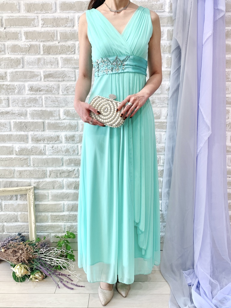 エメラルドグリーン バイカラータイウエストドレス