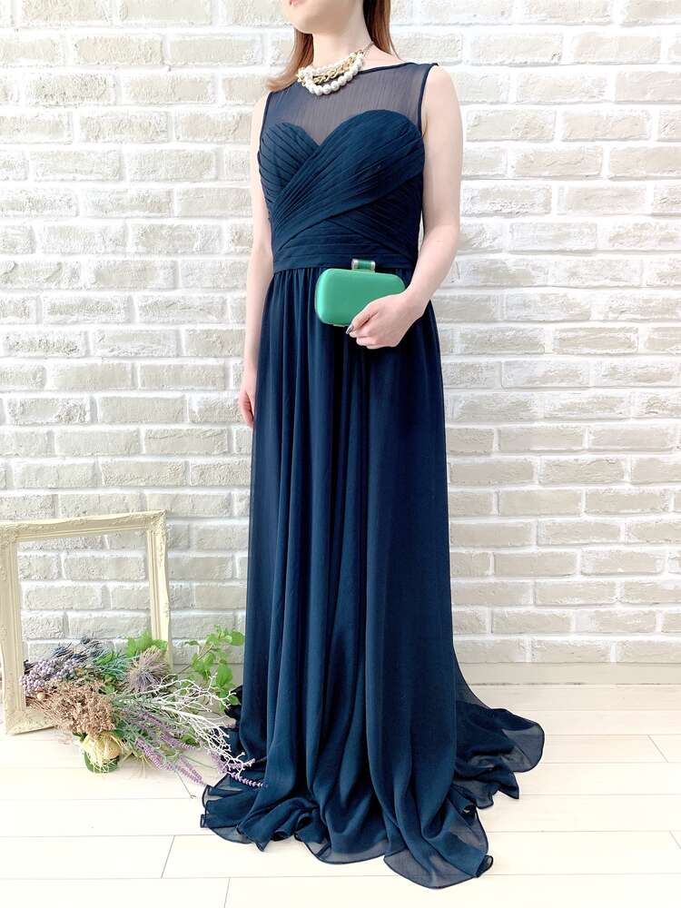 ネイビー胸下ビジュー付きプリーツロングドレス