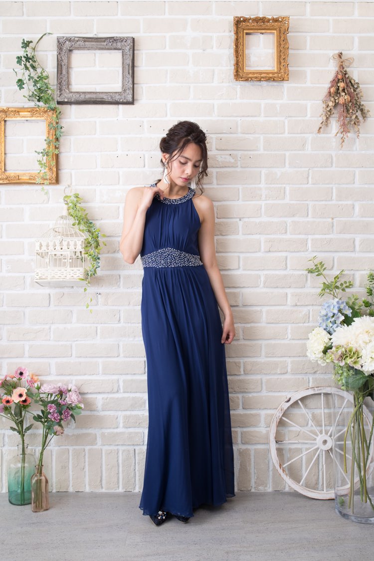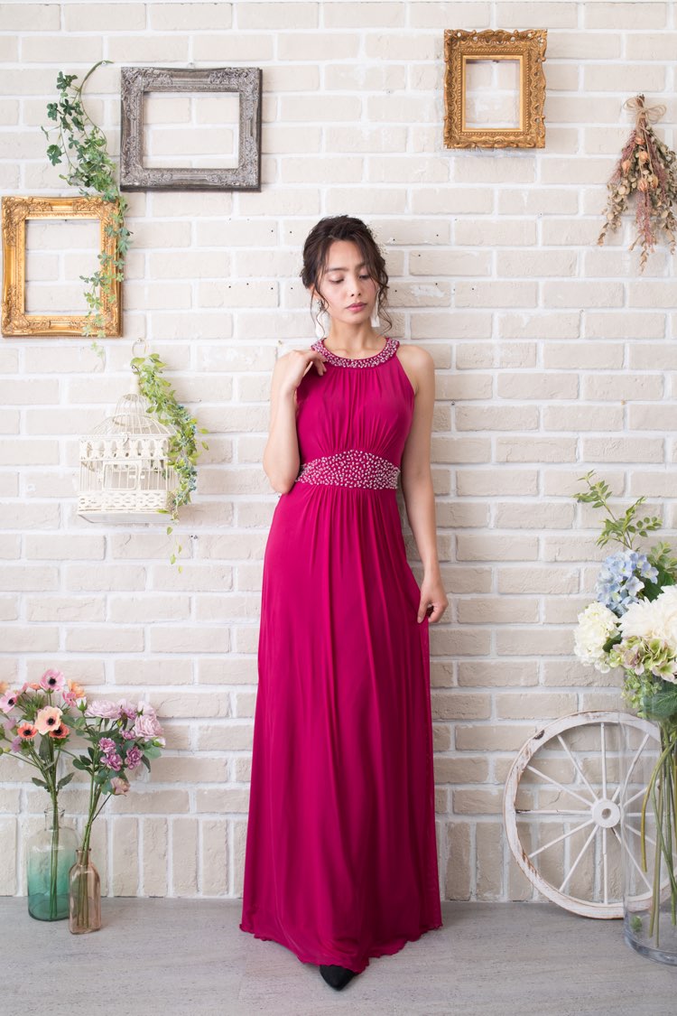 ベビーピンクのVカットウエスト切り替えノースリーブドレス