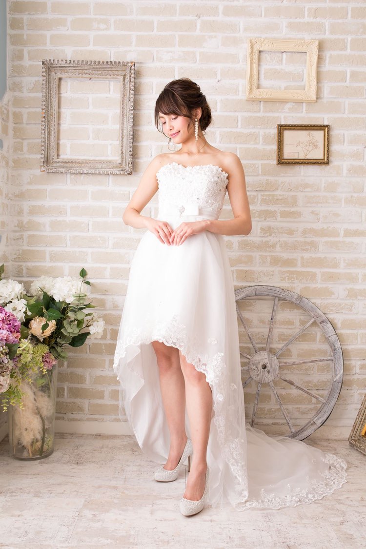 花嫁二次会、1,5次会向けアシンメトリーフロント膝丈トレーン長めのイルヘムレース柄ベアウェディングドレス