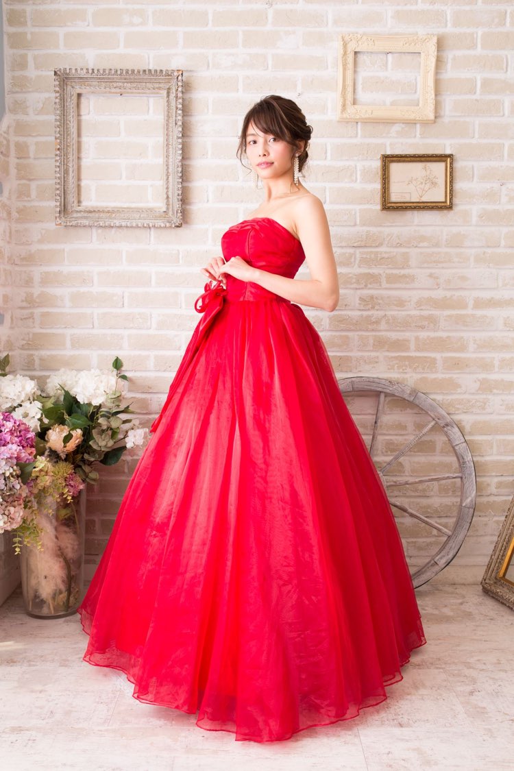 花嫁二次会、お食事か、演奏会向け レッドカラーボリュームベアAラインドレス