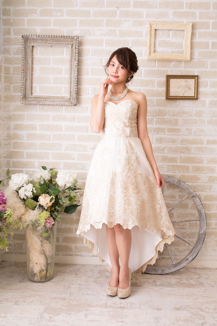 花嫁二次会、1,5次会向けアイボリー×ゴールド刺繍レース柄イルヘムデザインベアドレス