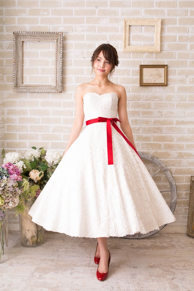 花嫁二次会、1,5次会、フォトウェディング、ホワイト全レースレウェスト切り替えAラインボリュームアンクル丈ウェディングドレス