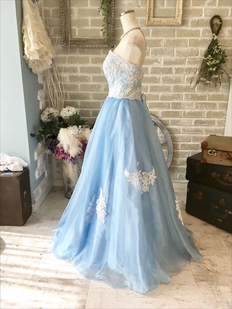 ライトブルーホワイト刺繍付きAラインボリュームカラーウェディングドレス