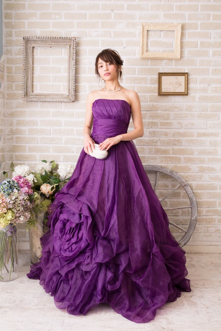花嫁二次会、1,5次会、ダークパープル胸下切り替えカラーウェディングドレス