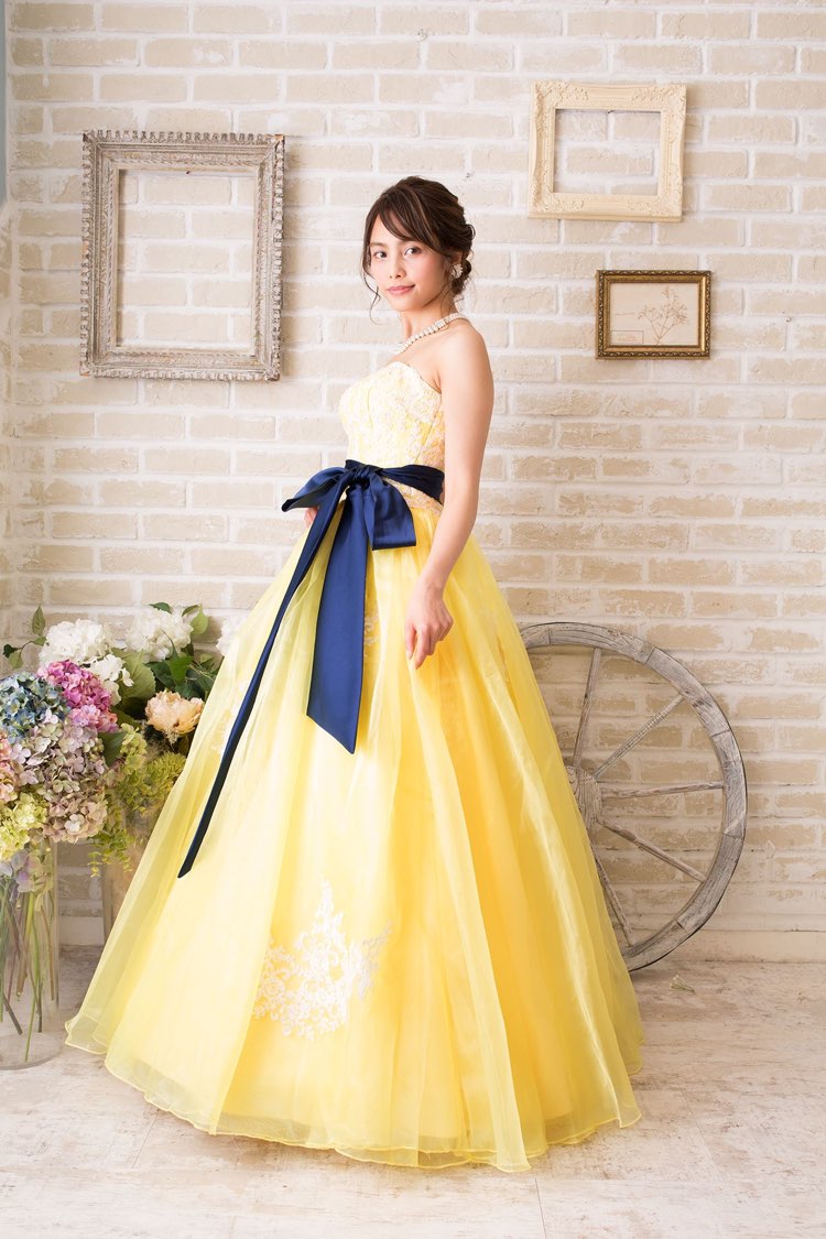 YNSウェディングイエローホワイトレースAラインベアカラードレス