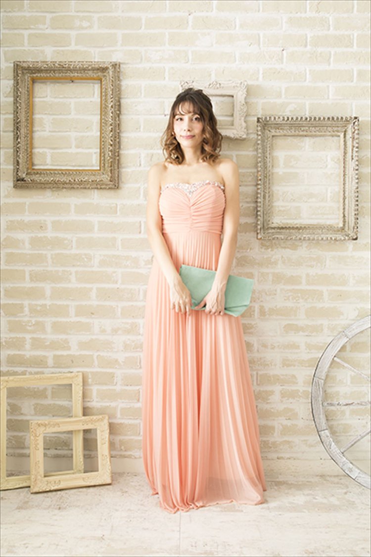 花嫁二次会向け ウェストパールビジュー付き膝丈ベアドレス