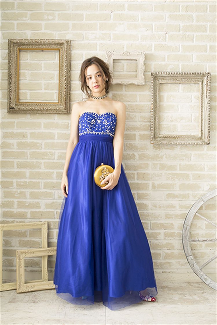 トップシルバースパンコール×アイスブルーチュールミモレ丈ベアドレス