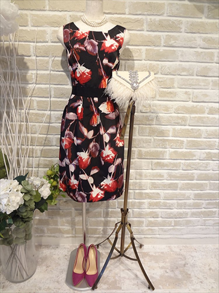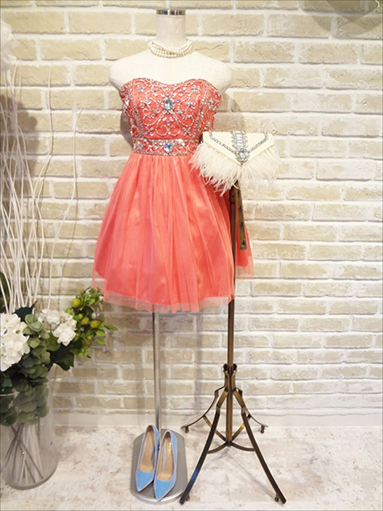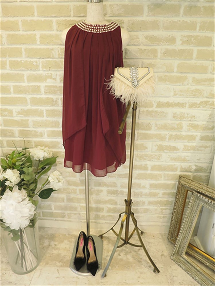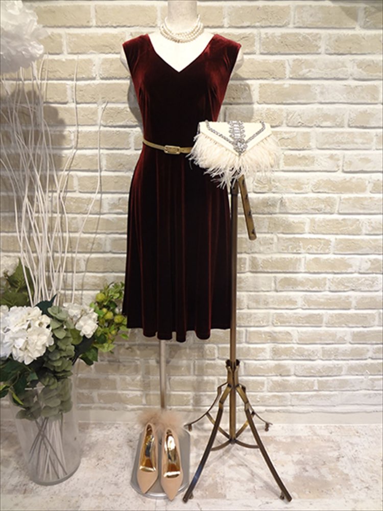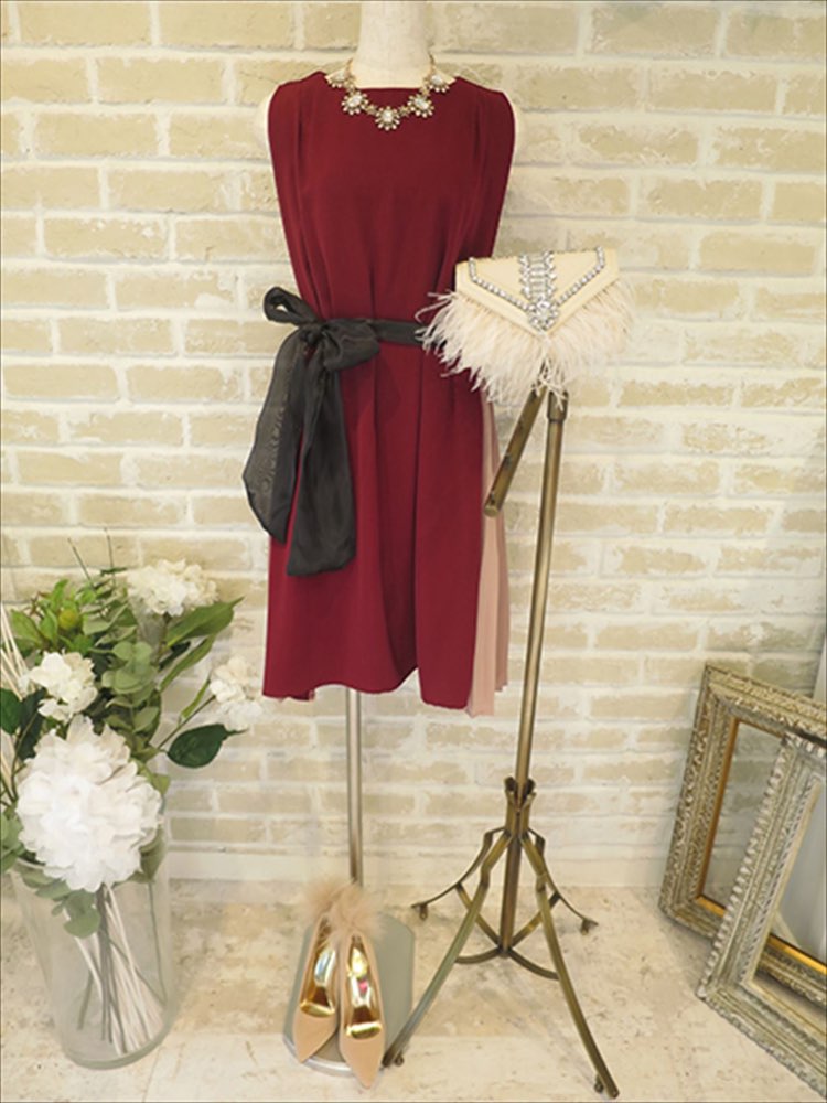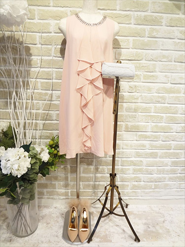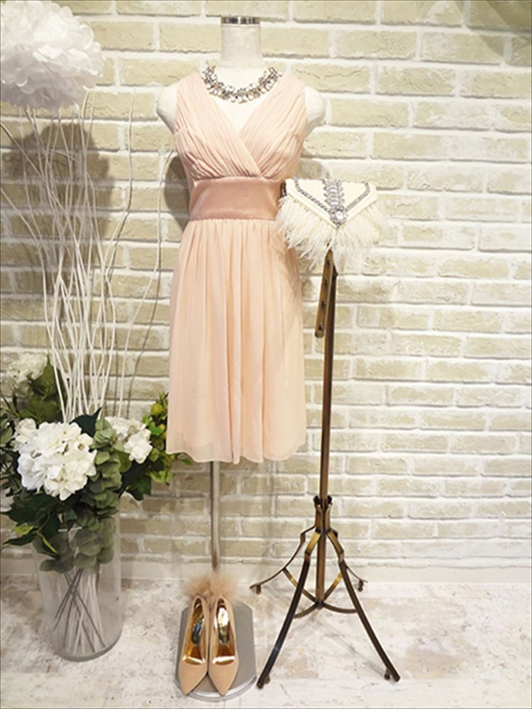 ベビーピンクのVカットウエスト切り替えノースリーブドレス